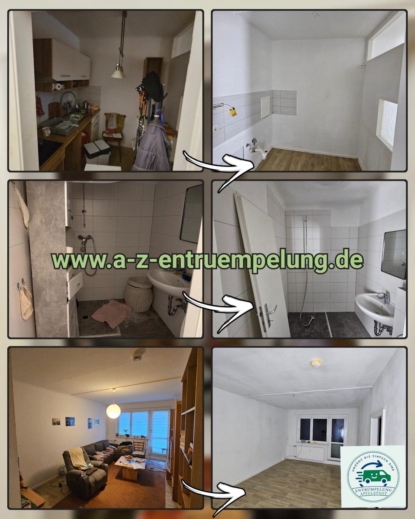 60 m² Wohnfläche, 2- Raum-Wohnung, 1. OG, gute Parksituation, normaler Hausrat (Möbel, Küche und Kleinkram): Entrümpelt und Entsorgt sowie Besenrein verlassen für insgesamt 900 Euro. Dauer: 1 Tag
